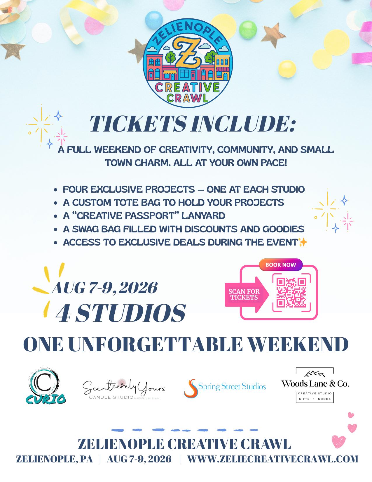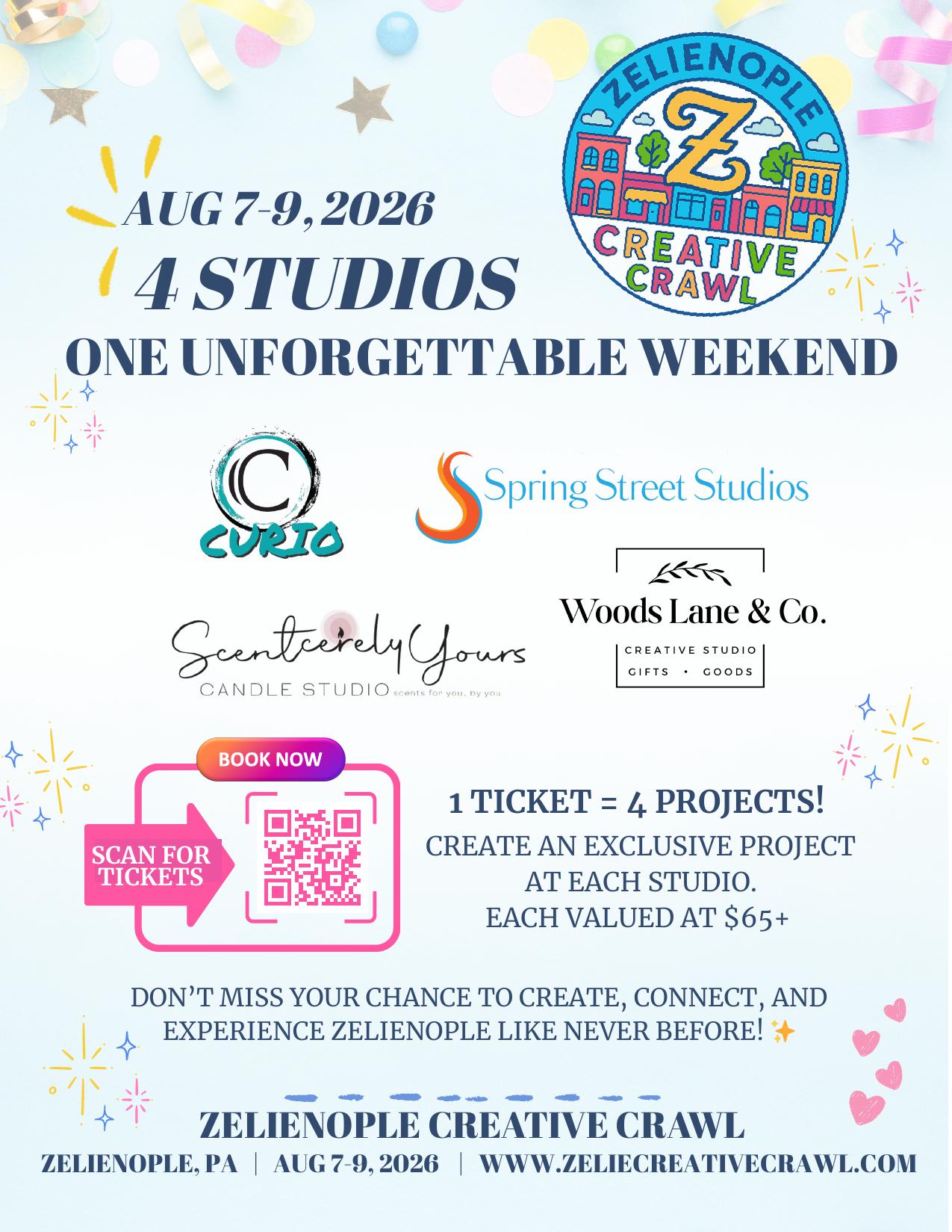 While you’re visiting Zelienople for the Shindig, you’re also going to want to check out the Creative Crawl, happening at four of our amazing studios on Main Street – Spring Street Studios, Curio, Woods & Lane and Scentcerely Yours!